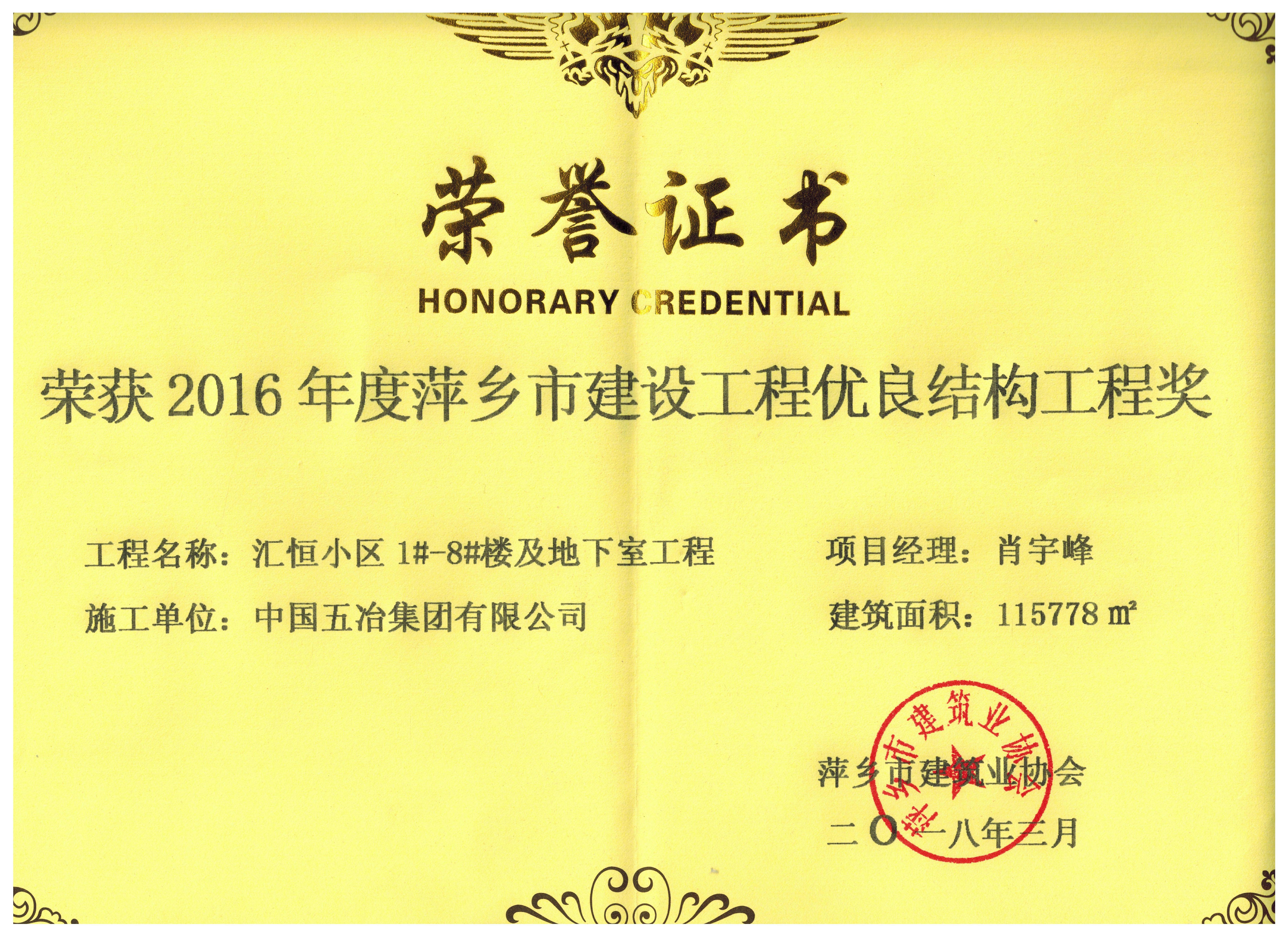 匯恒小區(qū)1#-8#樓及地下室工程榮獲2016年度萍鄉(xiāng)市建設(shè)工程優(yōu)良結(jié)構(gòu)工程獎(jiǎng)