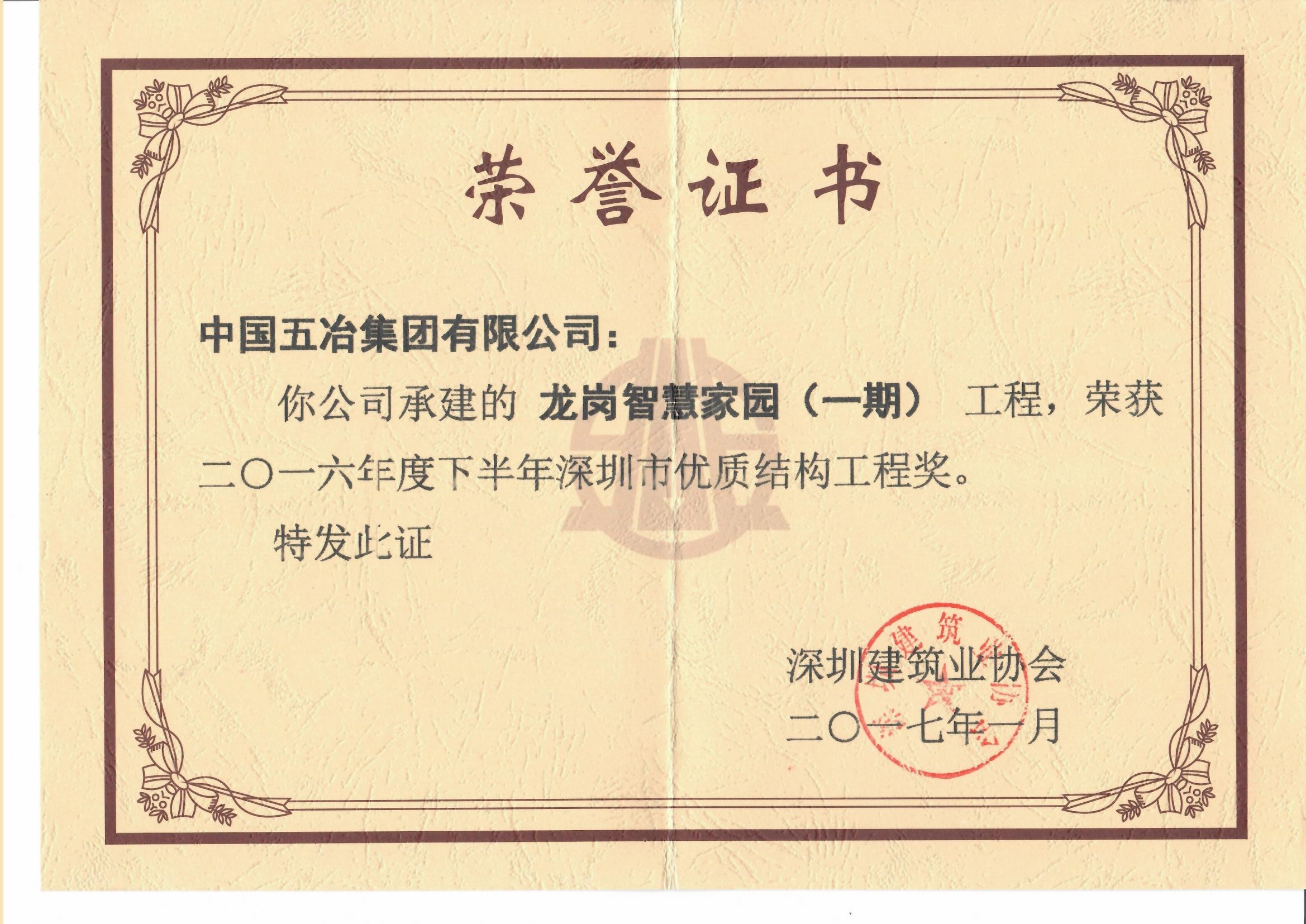 龍崗智慧家園(一期)工程榮獲二零一六年度下半年深圳市優(yōu)質(zhì)結(jié)構(gòu)工程獎(jiǎng)
