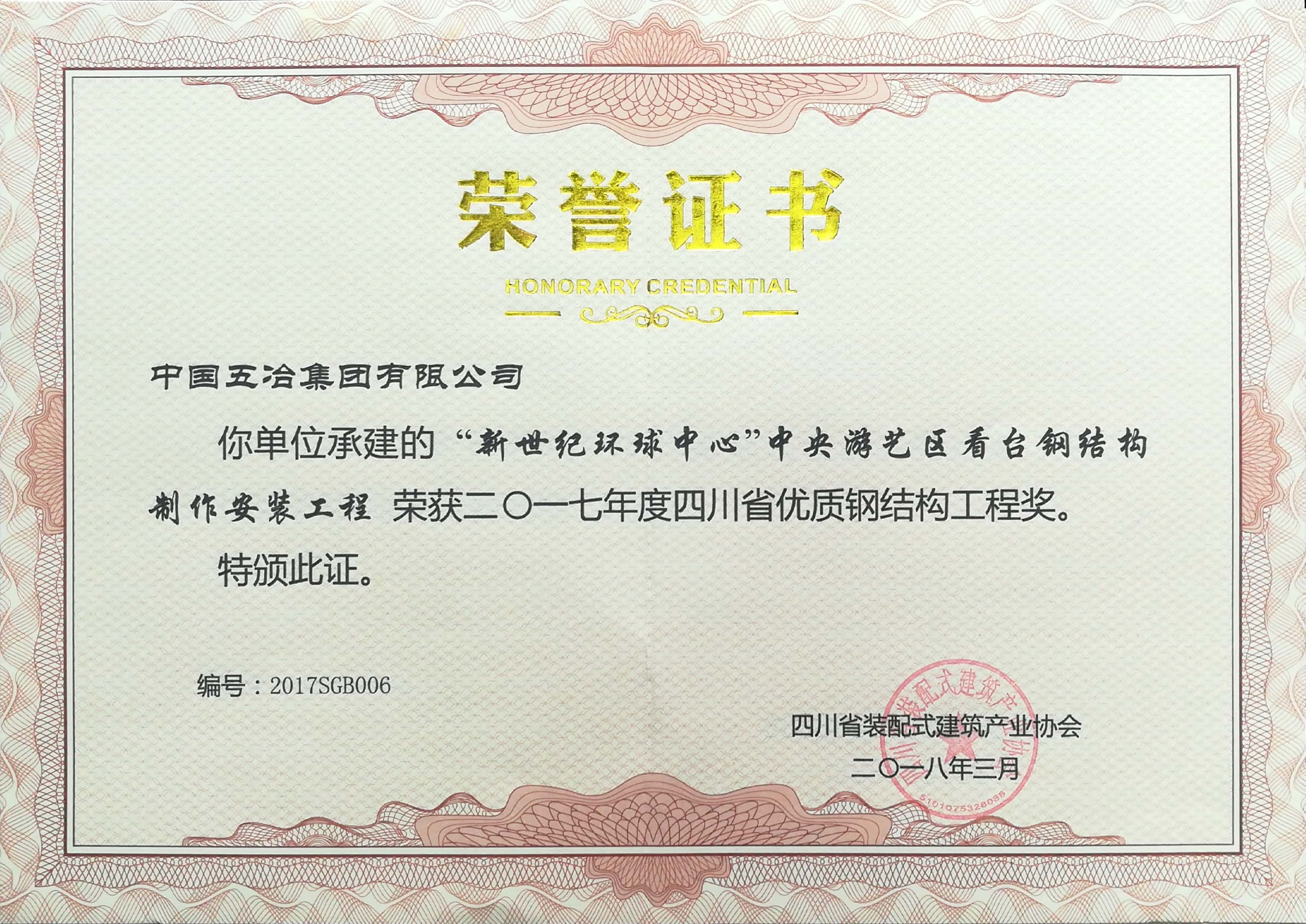 “新世紀環球中心”中央游藝區看臺鋼結構制作安裝工程-2017年度四川省優質鋼結構工程獎