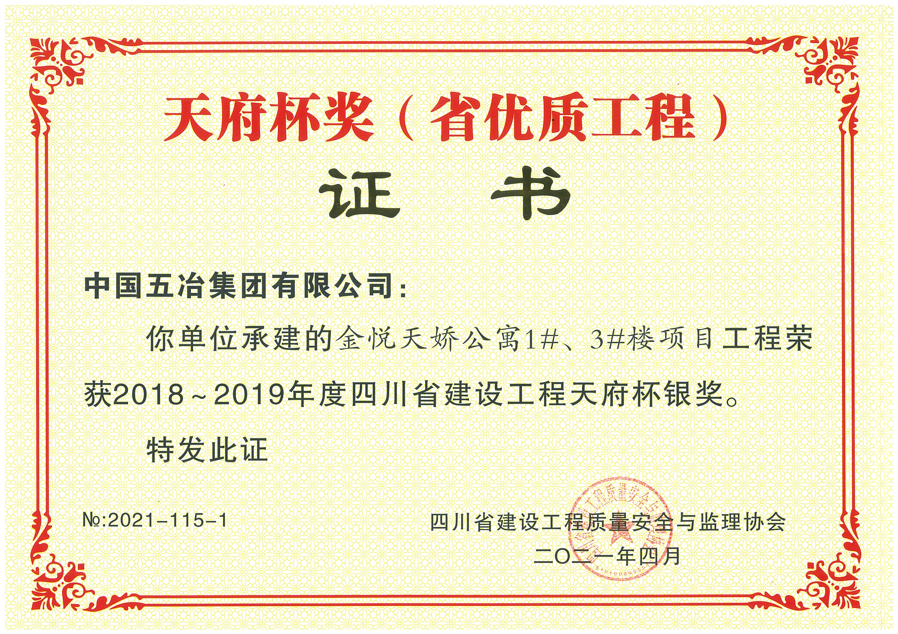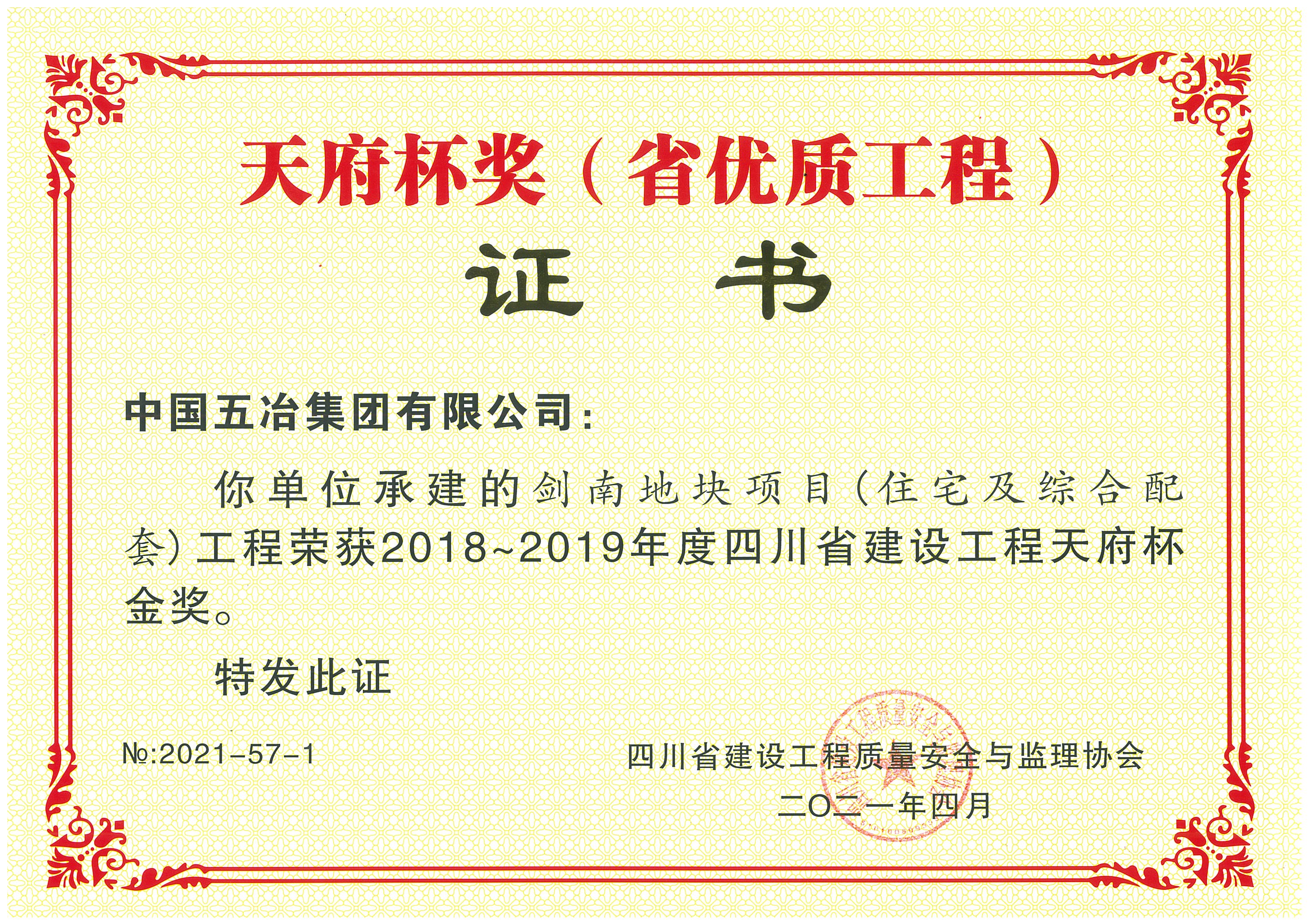 劍南地塊項目(住宅及綜合配套)工程-2018-2019年度四川省天府杯金獎