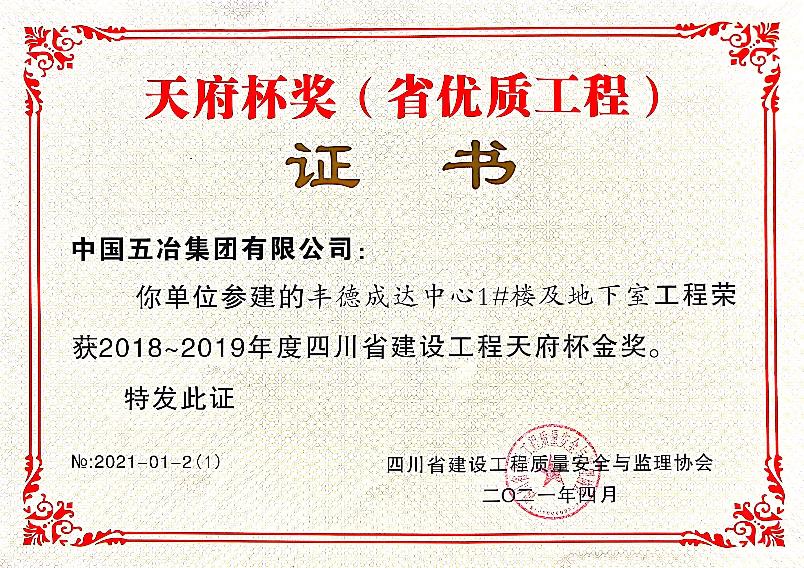 豐德成達中心1#樓及地下室-2018~2019年度四川省建設工程天府杯金獎