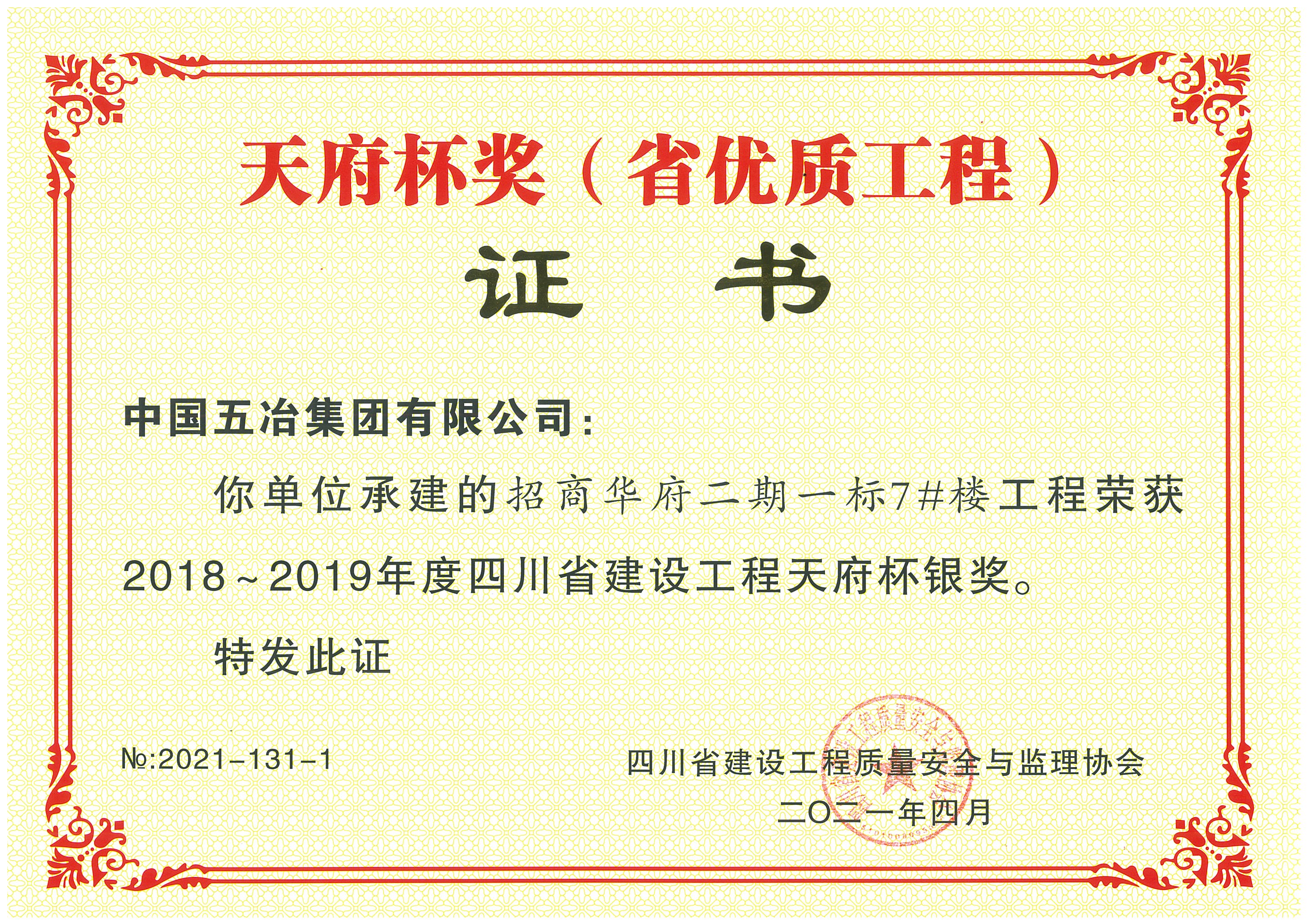 招商華府二期一標7#樓工程-2018-2019年度天府杯銀獎