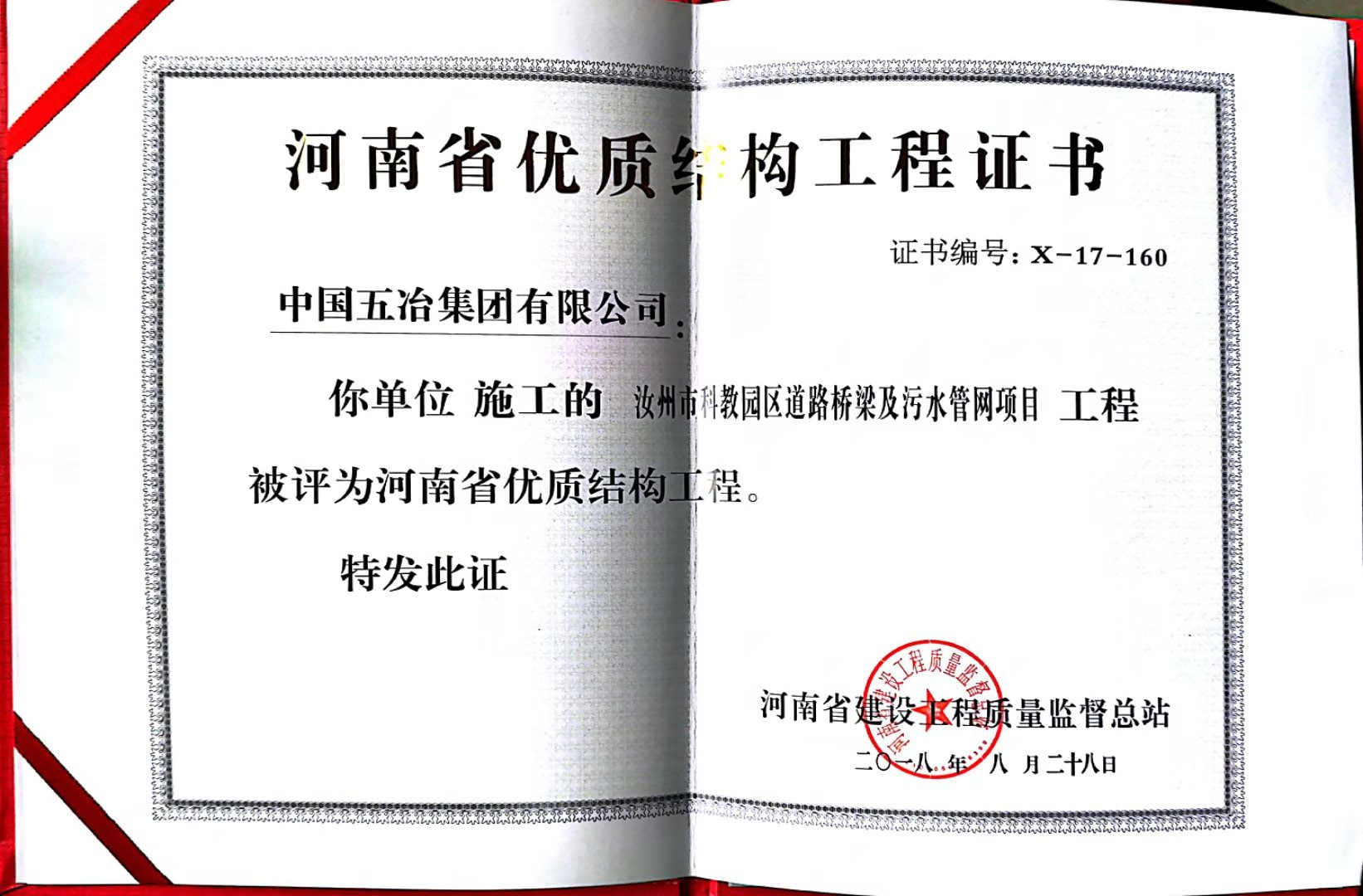 汝州科教園道路橋梁及污水管網(wǎng)工程榮獲2017年下半年度河南省優(yōu)質(zhì)結(jié)構(gòu)工程獎(jiǎng)