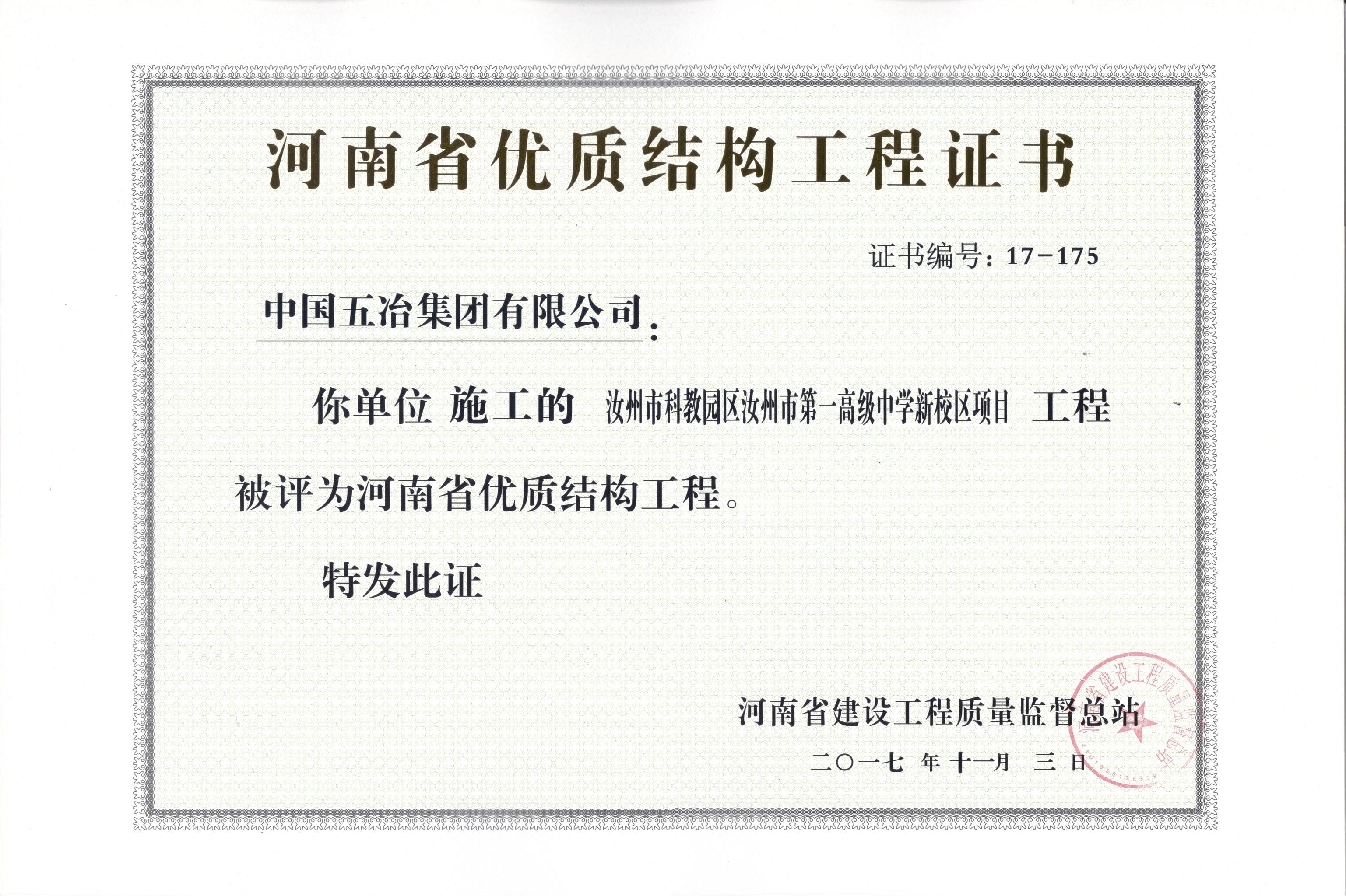 汝州市科教園區(qū)汝州市第一高級(jí)中學(xué)新校區(qū)項(xiàng)目工程榮獲2017年河南省優(yōu)質(zhì)結(jié)構(gòu)工程獎(jiǎng)