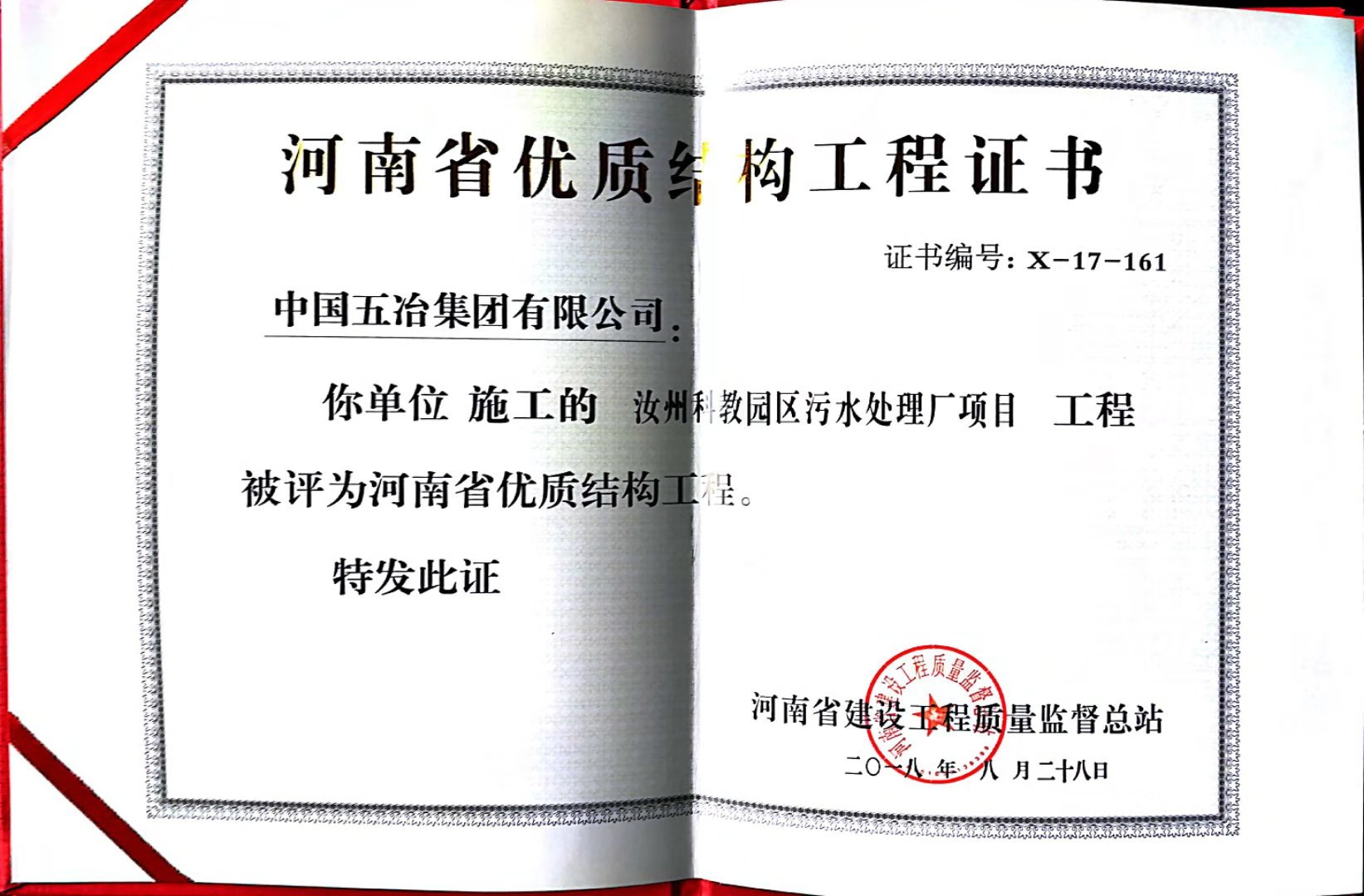 汝州科教園污水處理廠工程榮獲2017年下半年度河南省優(yōu)質(zhì)結(jié)構(gòu)工程獎(jiǎng)