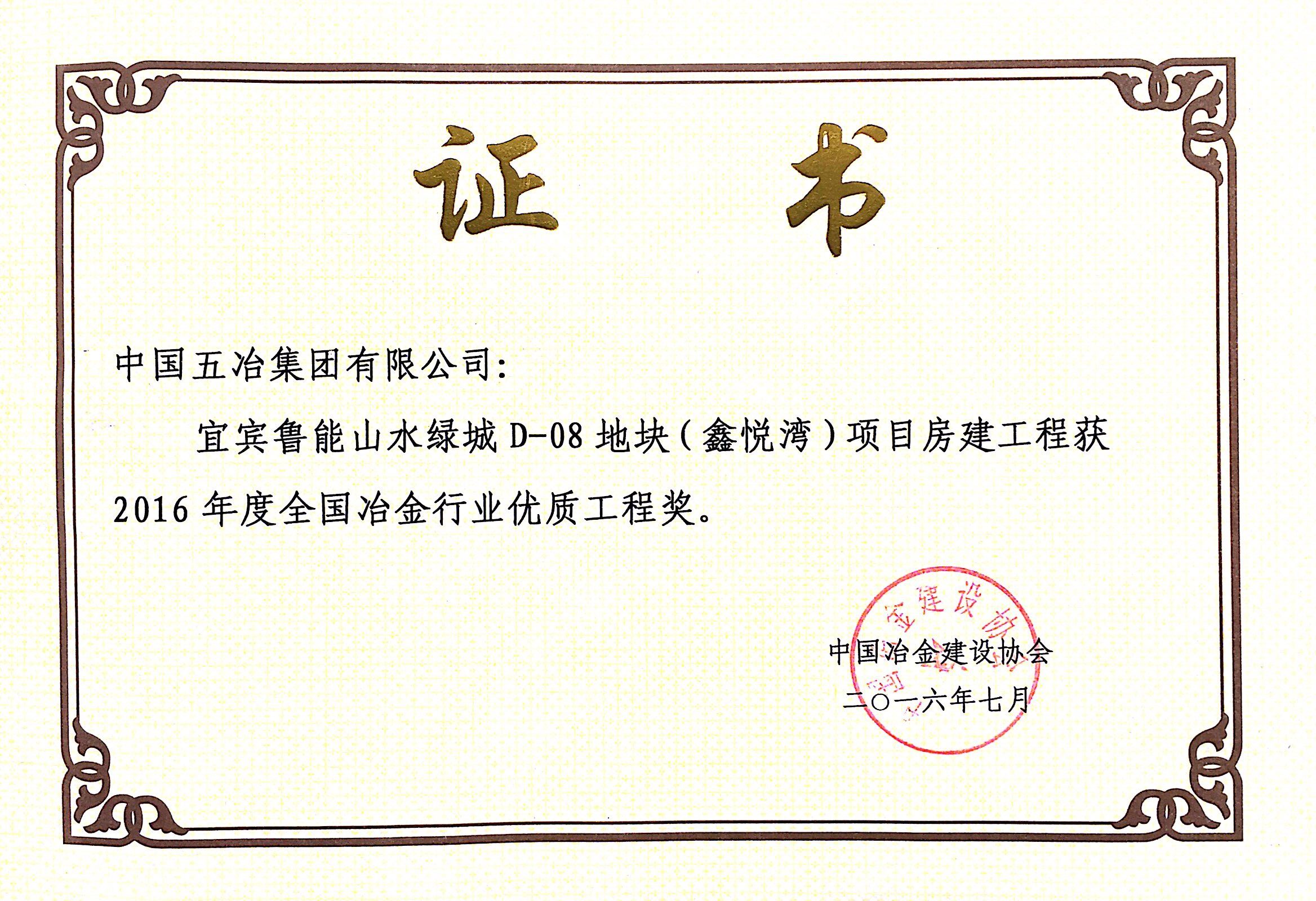 宜賓魯能山水綠城D-08地塊(鑫悅灣)項(xiàng)目—2016年度全國(guó)冶金行業(yè)優(yōu)質(zhì)工程獎(jiǎng)
