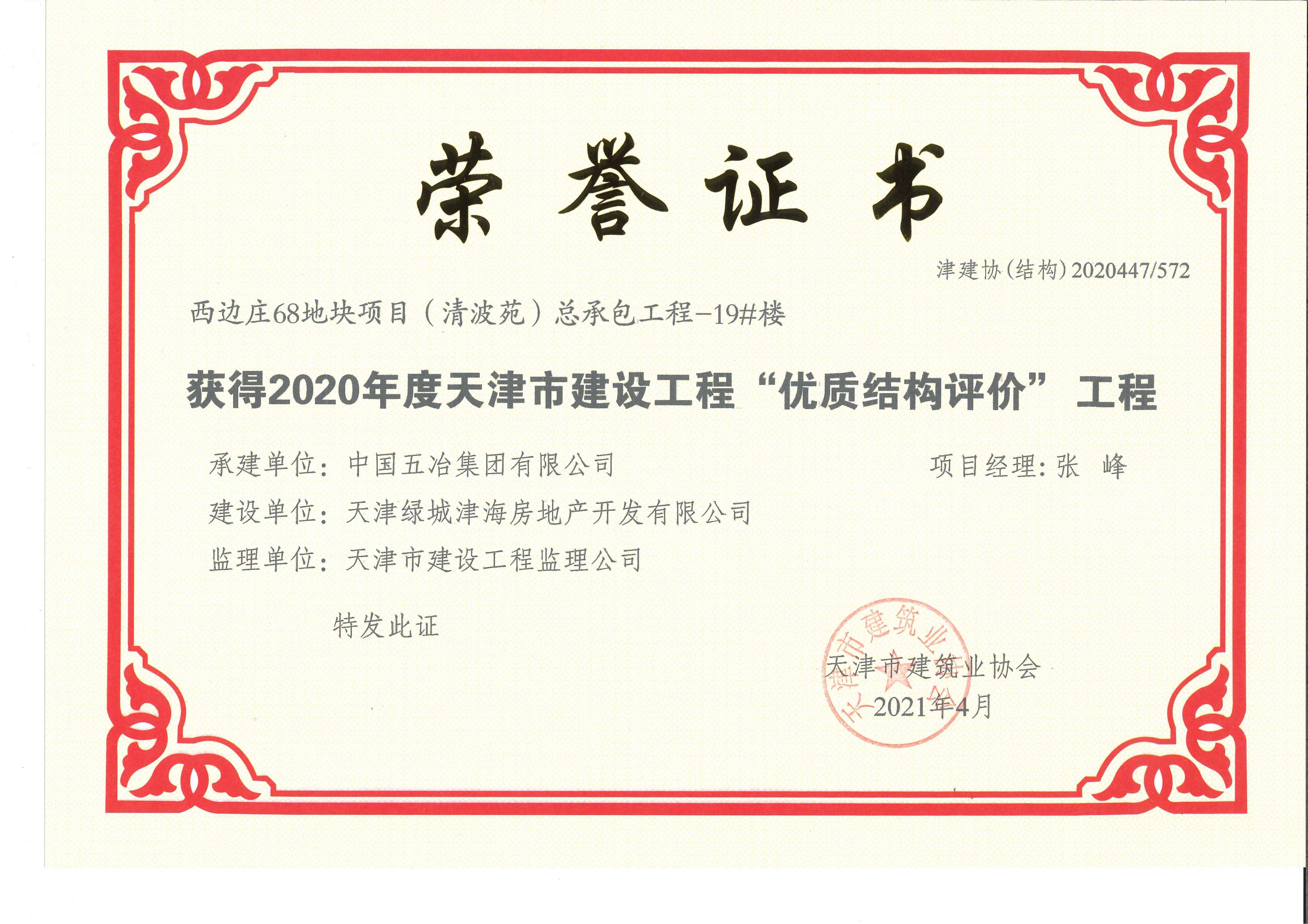 天津靜海綠城(西邊莊68地塊項目-清波苑總承包工程-19號樓)--2020年天津優質結構評價