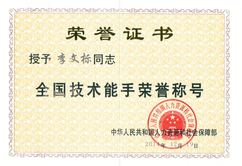 ????? 2014年12月19日,李文標同志榮獲國家人力資源社會保障部“全國技術能手”稱號。