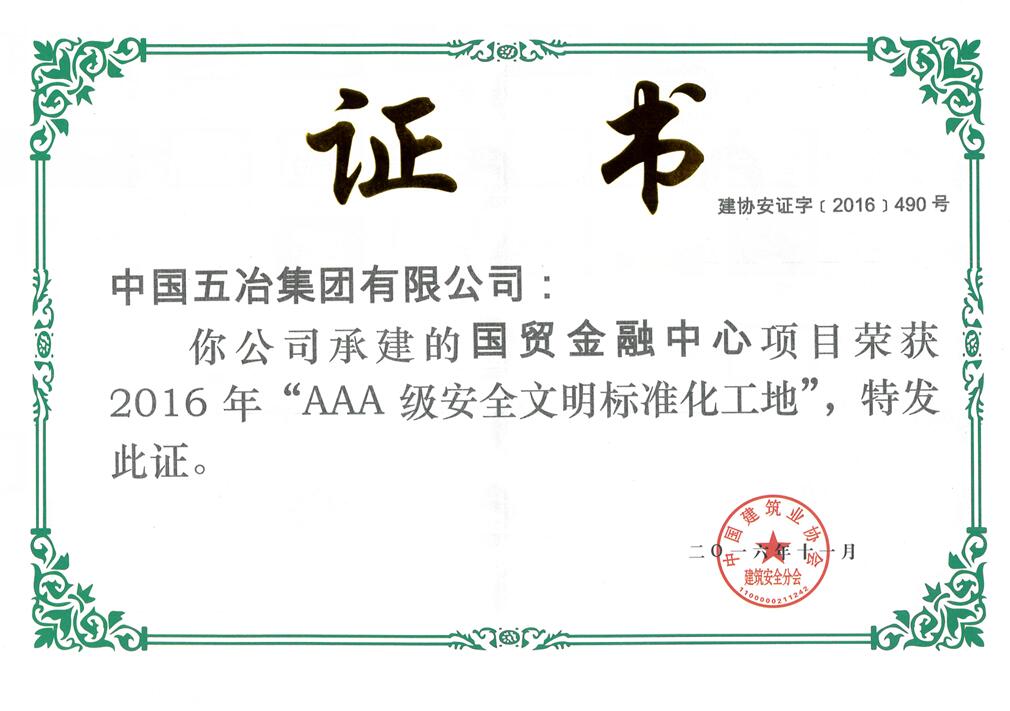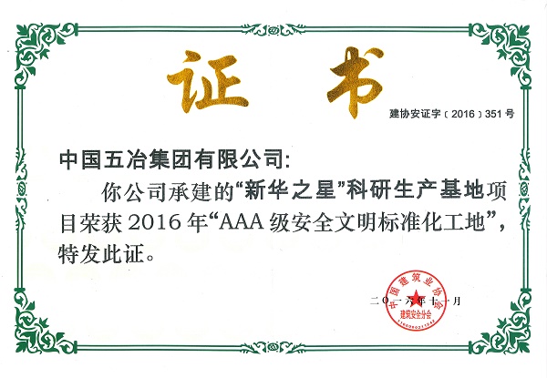 ? ?2016年12月,中國五冶集團新華之星”科研生產(chǎn)基地工程項目和國貿(mào)金融中心工程項目榮獲2016年全國“AAA級安全文明標準化工地”稱號。