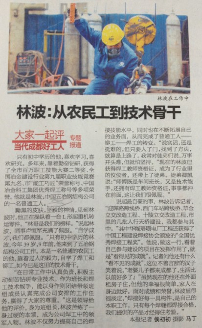 3月,公司工會踴躍參加成都市總工會“大家一起評——當代成都好工人”活動。通過比品德、比事跡、比貢獻等綜合評比,推薦了鋼構分公司焊工林波。4月初,成都市總工會在眾多參選者中經綜合考評后確定了20名候選人,林波位列其中。