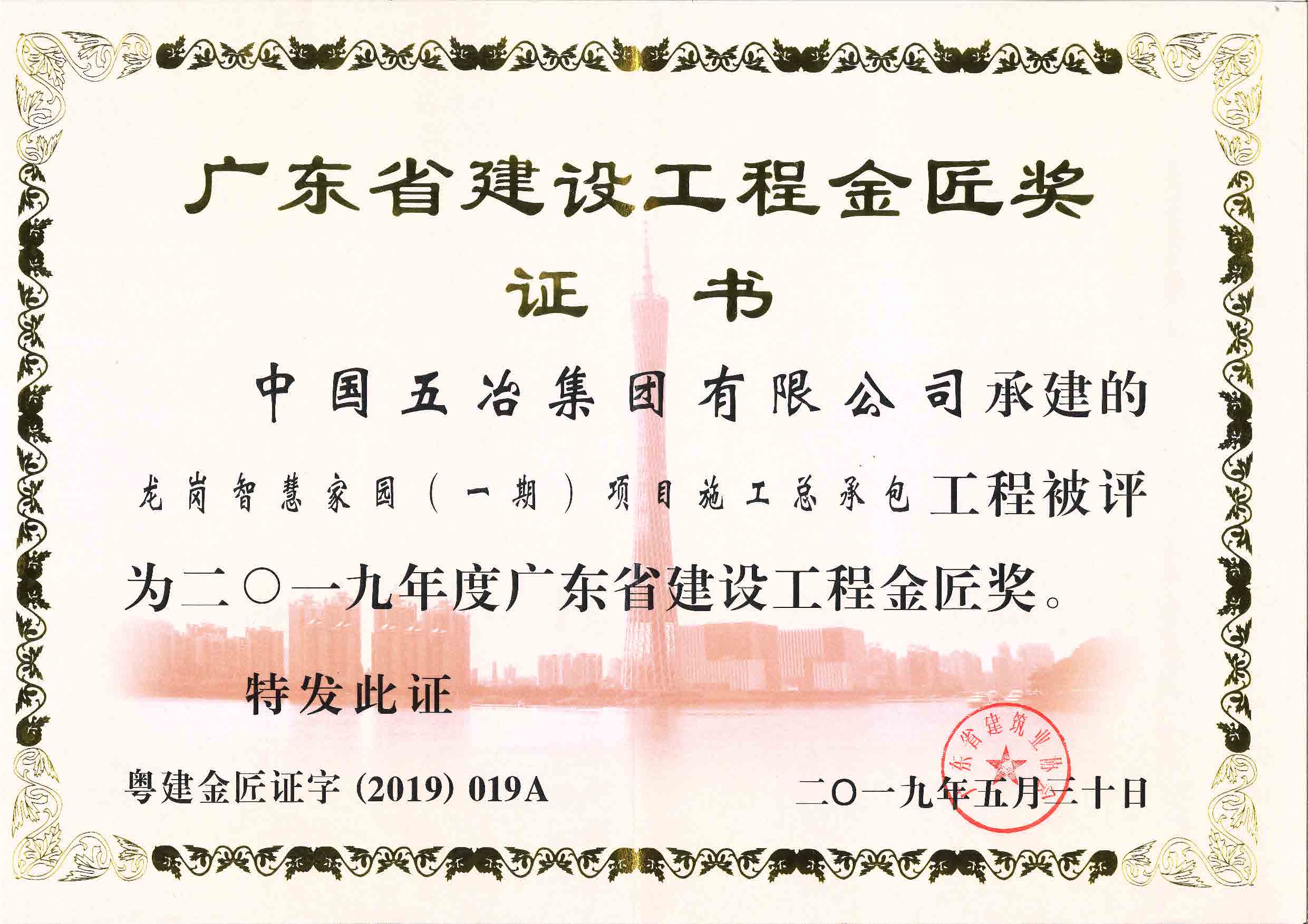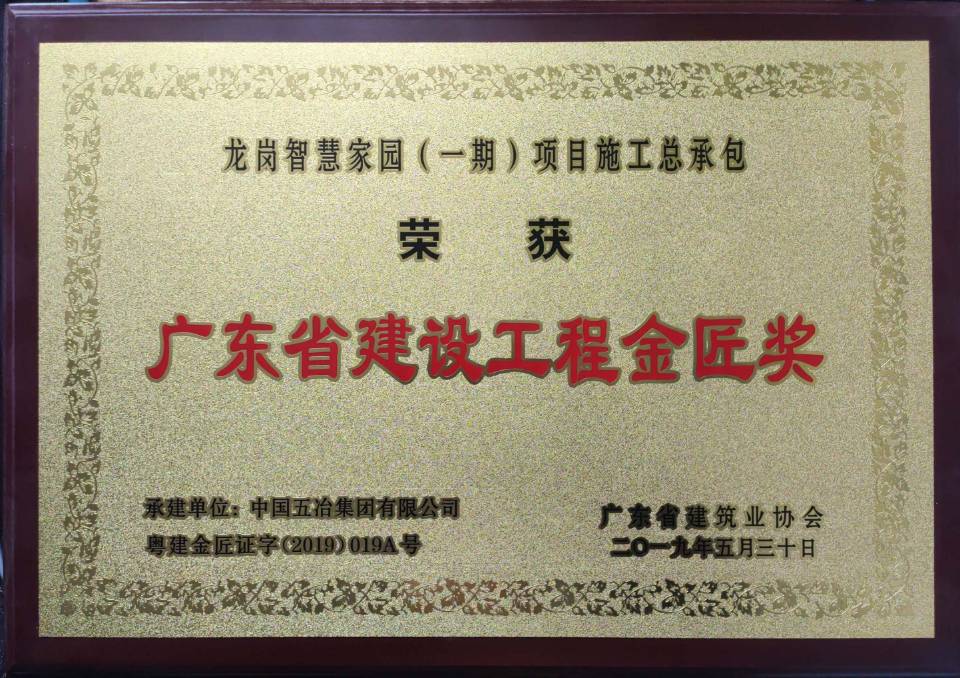 龍崗智慧家園(一期)項目施工總承包工程被評定為二〇一九年度廣東省建設工程金匠獎