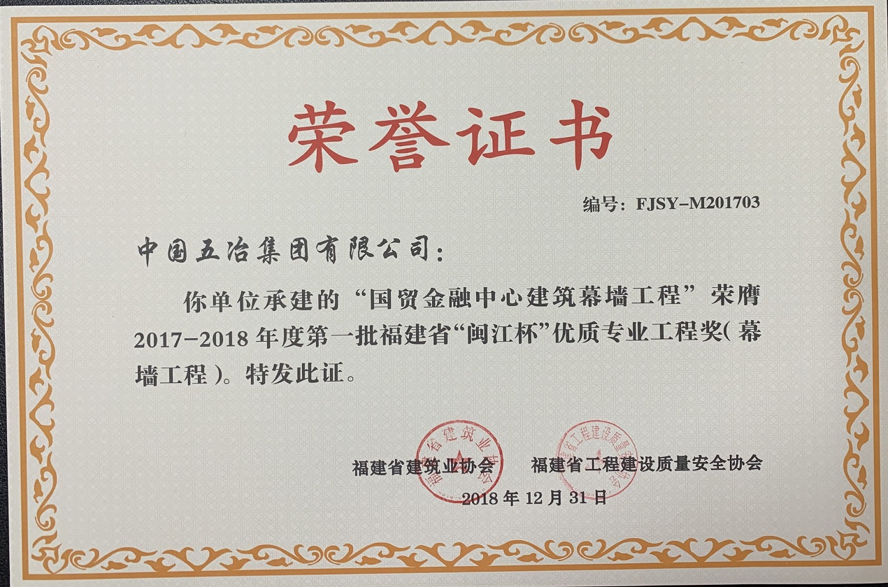 國貿(mào)金融中心建筑幕墻工程榮獲2017—2018年度第一批福建省“閩江杯”優(yōu)質(zhì)專業(yè)工程獎(幕墻工程)