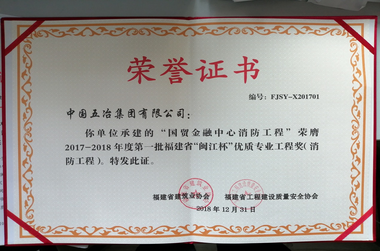國(guó)貿(mào)金融中心消防工程榮獲2017—2018年度第一批福建省“閩江杯”優(yōu)質(zhì)專(zhuān)業(yè)工程獎(jiǎng)(消防工程)