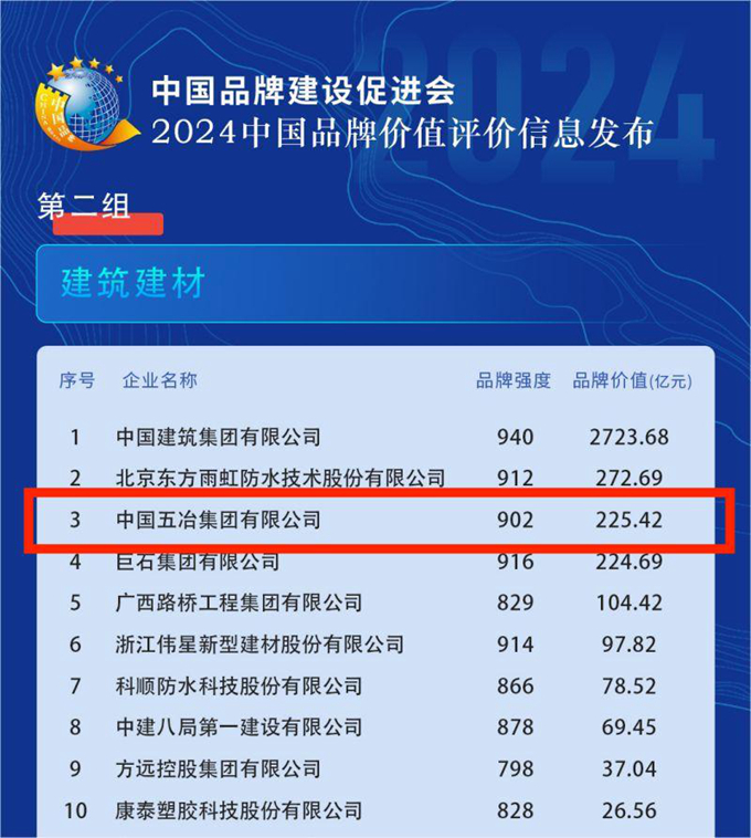 5月11日,第八個中國品牌日系列活動期間,中國品牌建設促進會聯合新華社、中國資產評估協會等單位聯合發布“2024中國品牌價值評價信息”,經權威評估,中國五冶集團品牌價值達到225億元,位列全國建筑建材領域參評企業前三,同類同級企業第一。