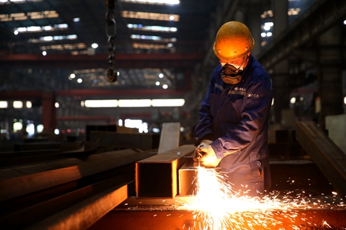 中國五冶鋼結(jié)構(gòu)生產(chǎn)基地內(nèi) 技術(shù)人員在焊花飛舞中加工部件